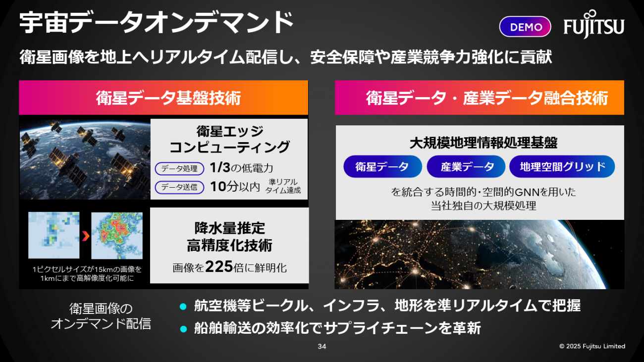 「宇宙」領域の研究開発では、衛星画像を地上へリアルタイム配信し、安全保障や産業競争力の強化に貢献するための衛星データ基盤技術、衛星データ・産業データの融合技術などを開発中だという。