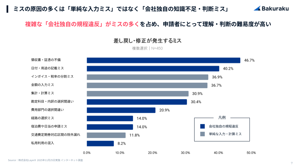 発生するミスの内訳を分析した結果、ミスの種類の過半数が「金額の入力ミス」といった「単純な入力・計算ミス」よりも、「自社規程に関する不備」に起因するものであることが判明。特に発生割合が高い原因の上位には「領収書・証憑の不備(46.7%)」や「日付・用途の記載ミス(40.2%)」が挙げられているとのことだ。