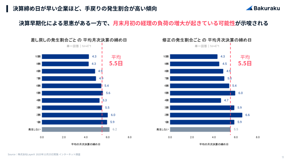 5. 発生割合と決算締め日の関係性:決算締め日が早い企業ほど、差し戻し・修正の発生割合が高い傾向
