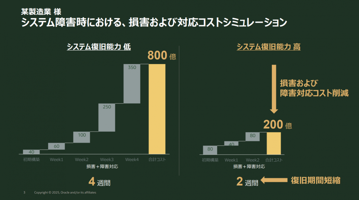 佐藤氏はまず、とある製造業の企業で行われた、システム障害時における損害・対応コストのシミュレーションを紹介した。まず、障害発生時には復旧が早ければ早いほど損害を抑えられるわけだが、いわゆるIT-BCPやDRなどといったリスクへの備えが十分にできていない企業(=システム復旧能力が低い)では、障害対応に4週間を要し、合計コストは800億円にのぼるという試算が出たようだ。
