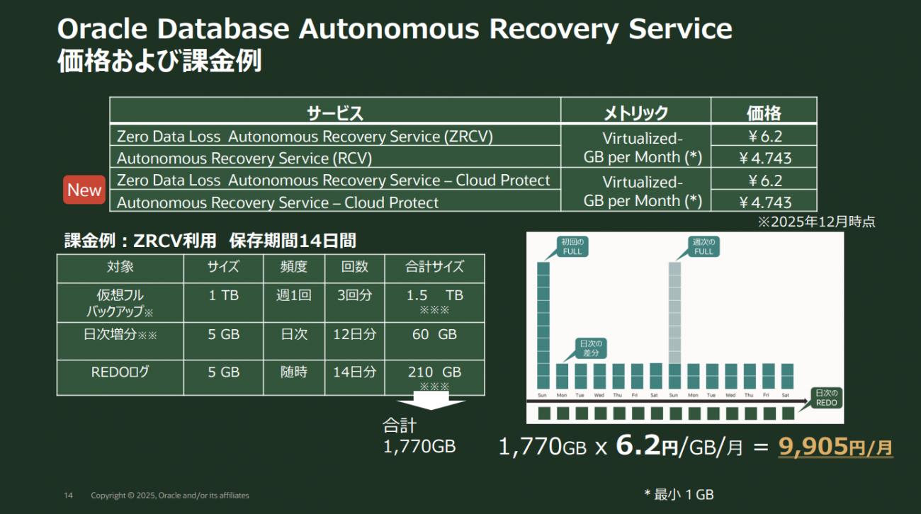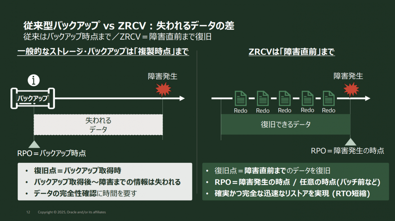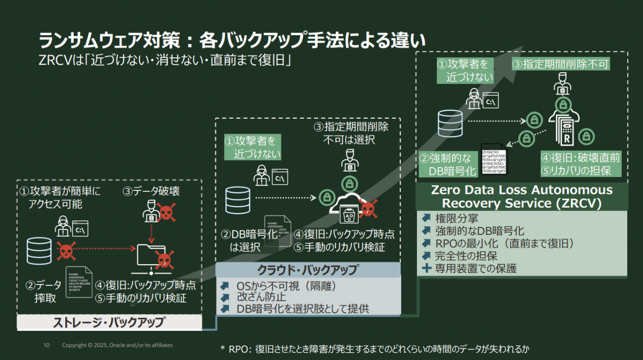 ここからは同社の大澤清吾氏が、約2年前から提供しているフルマネージド型のデータ保護サービス「Oracle Database Zero Data Loss Autonomous Recovery Service(以下、ZRCV)」について説明した。同サービスの特徴として、大澤氏は「ランサムウェアへの耐性強化」「本番環境への影響を極小化」「クラウドで低コスト・シンプルな運用」の3つを挙げた(次図)。