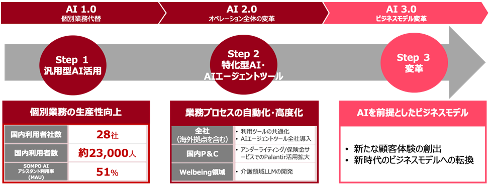 SOMPOホールディングスは2016年からDX戦略を推進しており、独自開発の生成AIや業務特化型AIの実装を進めてきたという。AI技術の進化を背景に、社員の生産性・創造性向上や業務プロセスの抜本的見直しを目指して、組織全体の変革に取り組む。