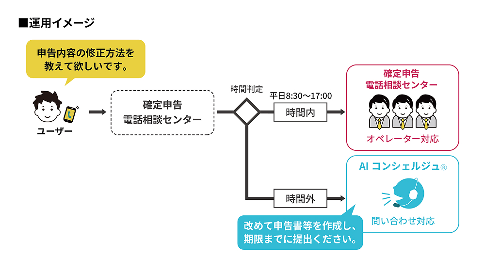 AIコンシェルジュは、AIを活用した電話自動案内システム。通話時に人の発する言葉を音声認識でテキスト化し、辞書やデータベースと連携して適切な回答を抽出、音声合成によって回答するAIソリューションだという。今回の導入によって、税務署や確定申告電話相談センターの稼働時間外における電話での問い合わせ対応が自動化されたとしている。