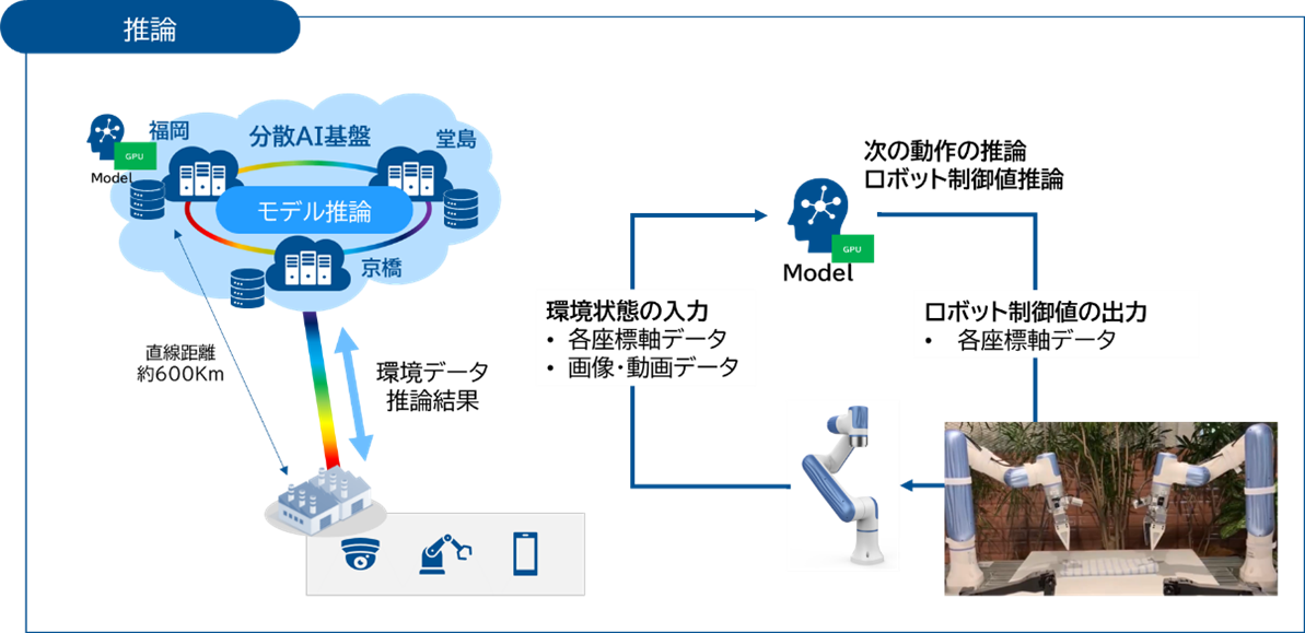 大阪京橋、堂島および福岡の3拠点をIOWN APNで接続し、分散データセンターを構成した環境において、自律型協働ロボティクスの模倣動作によるモデル学習および遠隔推論動作に成功したとのことだ。