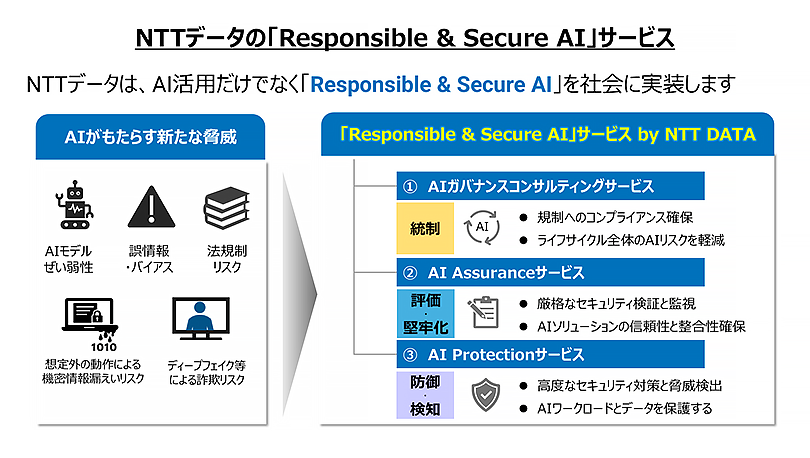 NTTデータは、企業におけるAIの安心・安全な活用を支援する「Responsible & Secure AI」サービスを2026年1月より本格展開すると発表した。