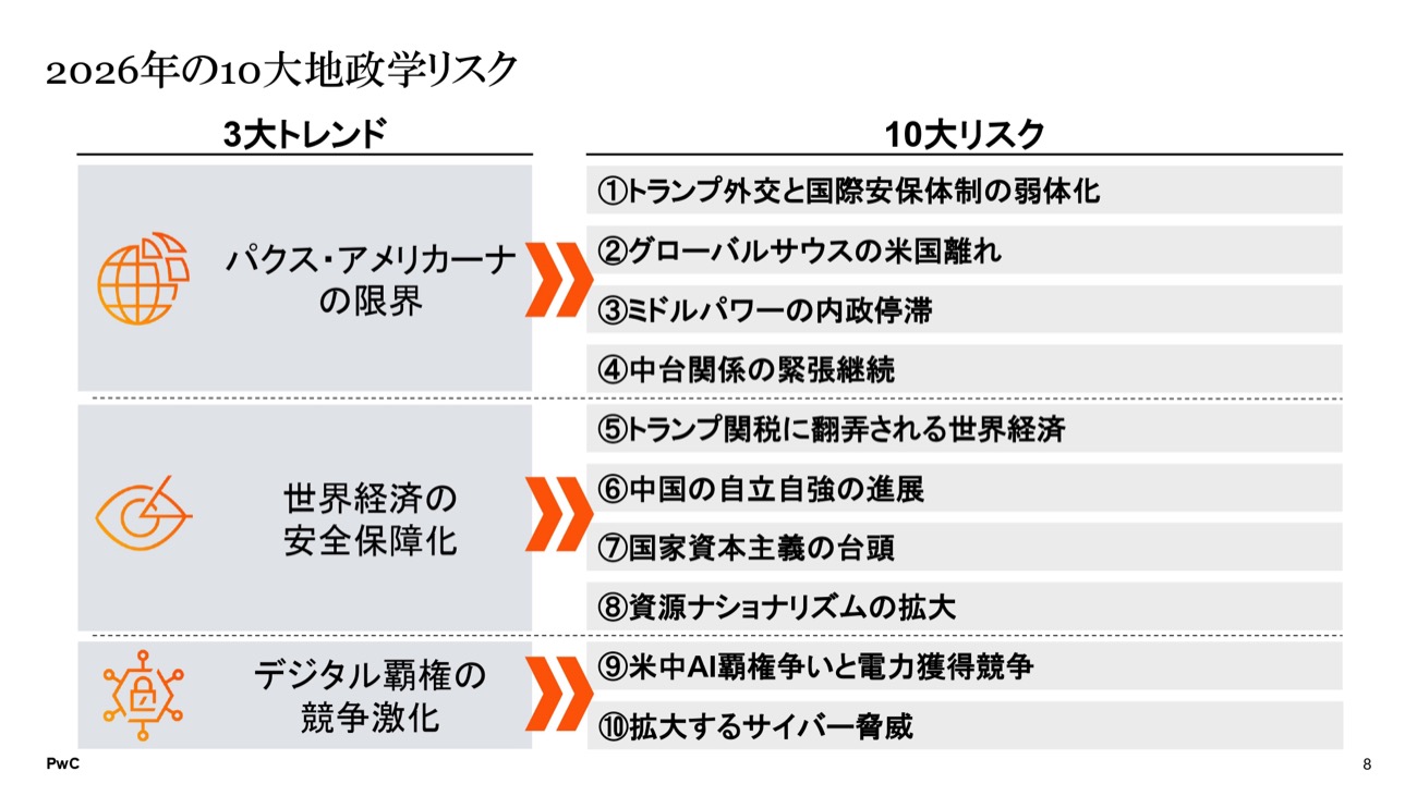 続いてPwC Japan合同会社シニアマネージャーの南大祐氏が、PwCが2019年から毎年発行している「重大リスク展望」レポートの内容を解説した。このレポートでは、個別のリスクを議論する前に「3大トレンド」を示している。今回示されたのは「パクス・アメリカーナの限界」「世界経済の安全保障化」「デジタル覇権の競争激化」の3つである。