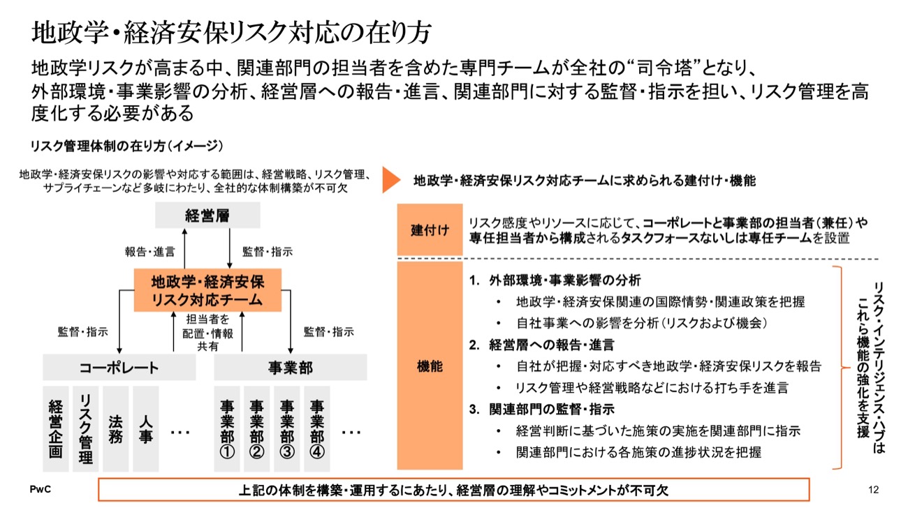 地政学リスク対応の理想形として南氏は、経営層の下にコーポレートや事業部の関係部署をまとめる対応チームを設置し、外部人材の登用や社内人材の育成を含めて専門人材を配置することを挙げた。部門間の情報連携を担う「司令塔」としての役割が重要であり、縦割りの弊害を解消する必要があるという。