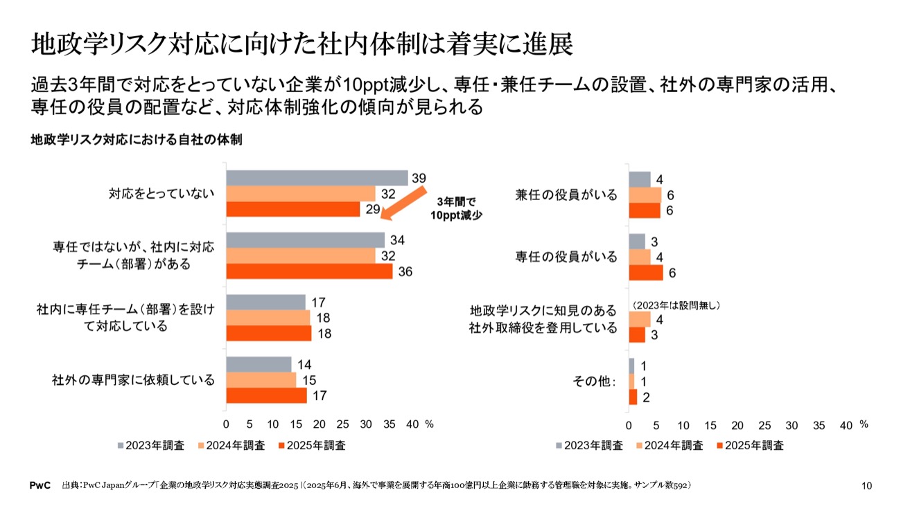 南氏は、海外展開する売上高1,000億円以上の日系企業を対象とした3年間の調査結果も紹介した。地政学リスクへの「対応をとっていない」と回答した企業は4割近くあったが、この3年で約10%減少しており、対応自体は進んでいる。社内に対応チームを設置する企業や、経済安全保障担当の役員を置く企業も増えてきた。