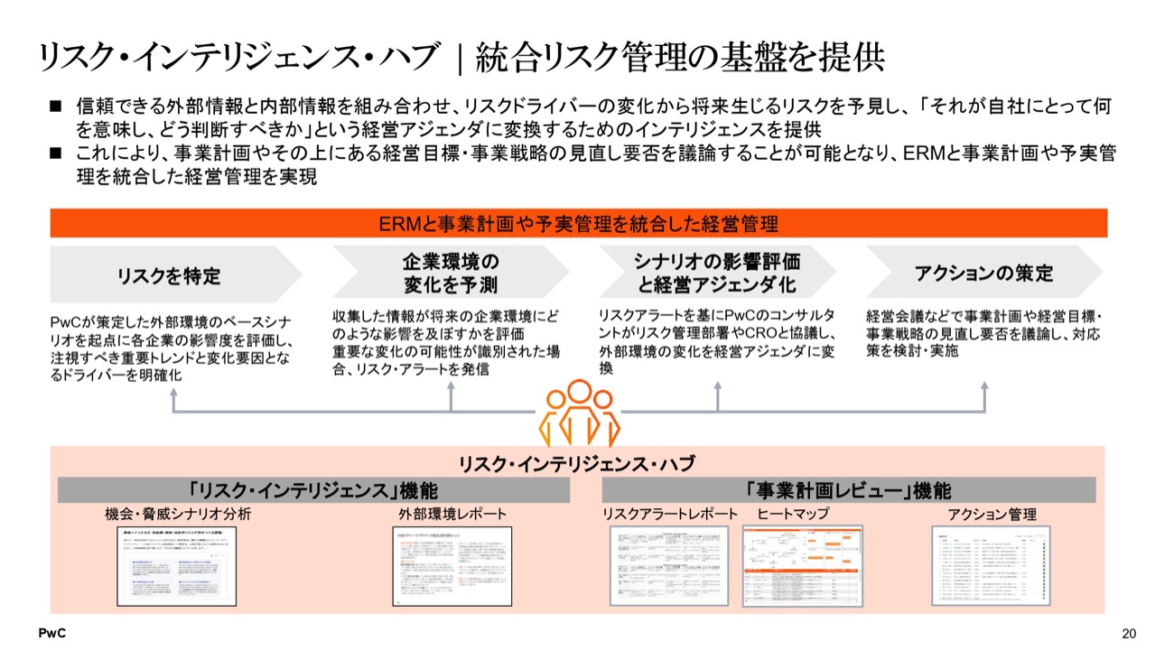 リスク・インテリジェンス・ハブは「リスクインテリジェンス機能」と「事業計画レビュー機能」の2つで構成される。リスクインテリジェンス機能では、企業の事業計画を起点として、各機能・事業ごとに想定されるリスクシナリオを整理し、事業計画の実行を阻害しうる重要な要素を「チョークポイント」として設定する。関連する外部環境要因を特定し、専門チームがオープンソース情報やPwC独自の情報ソースを用いて継続的にモニタリングを行い、重要な変化の兆候が生じた場合にアラートを発信する仕組みだ。
