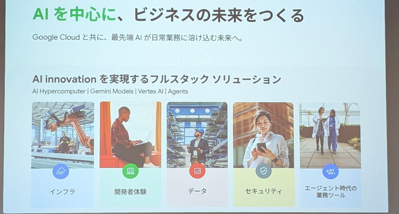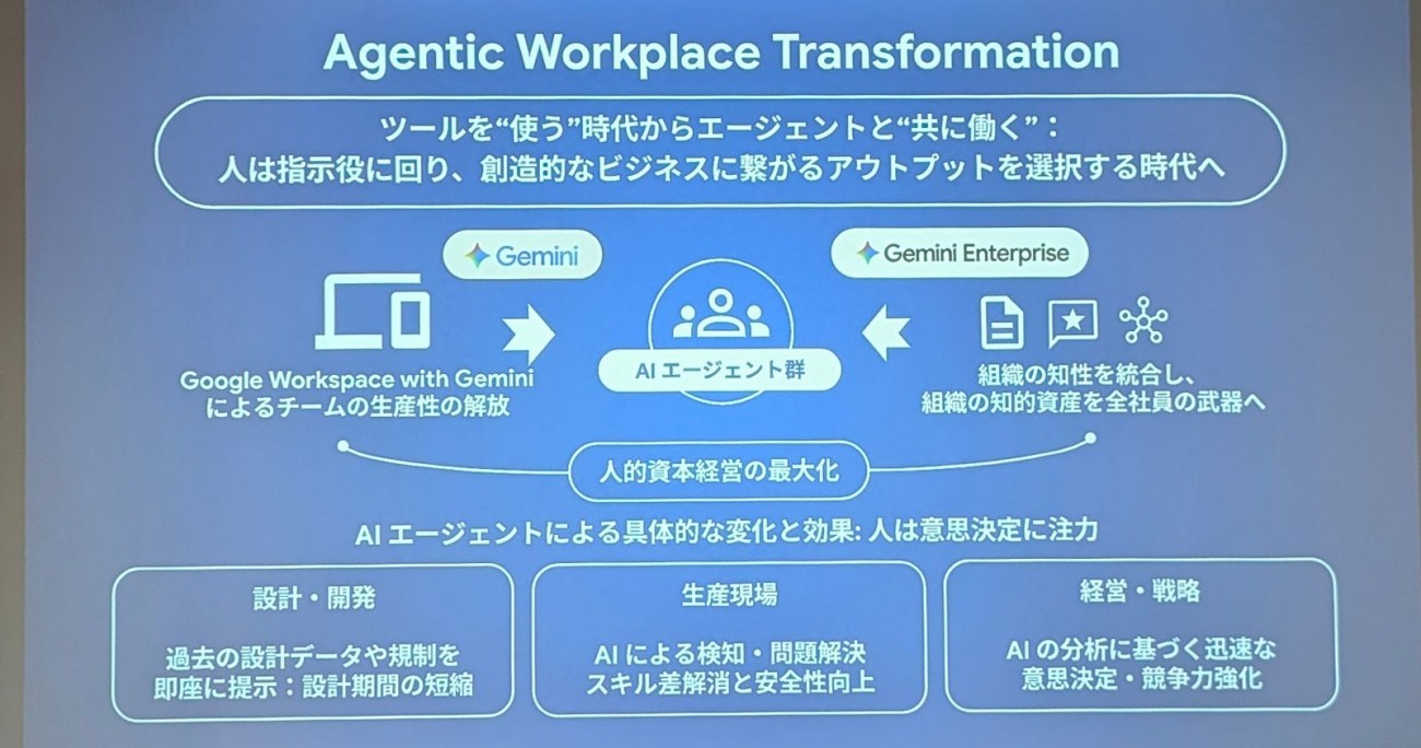 Google Workspace担当の執行役員 山銅章太氏は「形を変えるのは今年」と宣言し、組織の知的財産を自律的に活用する「Agent Workplace Transformation」を提唱した。また、アプリケーションモダナイゼーション担当の小林昌利氏は顧客とスペシャリストが伴走する「TAP(Tech Acceleration Program)」を通じ、NECやすかいらーくホールディングスが数日という短期間でプロトタイプ構築に成功した事例を紹介。