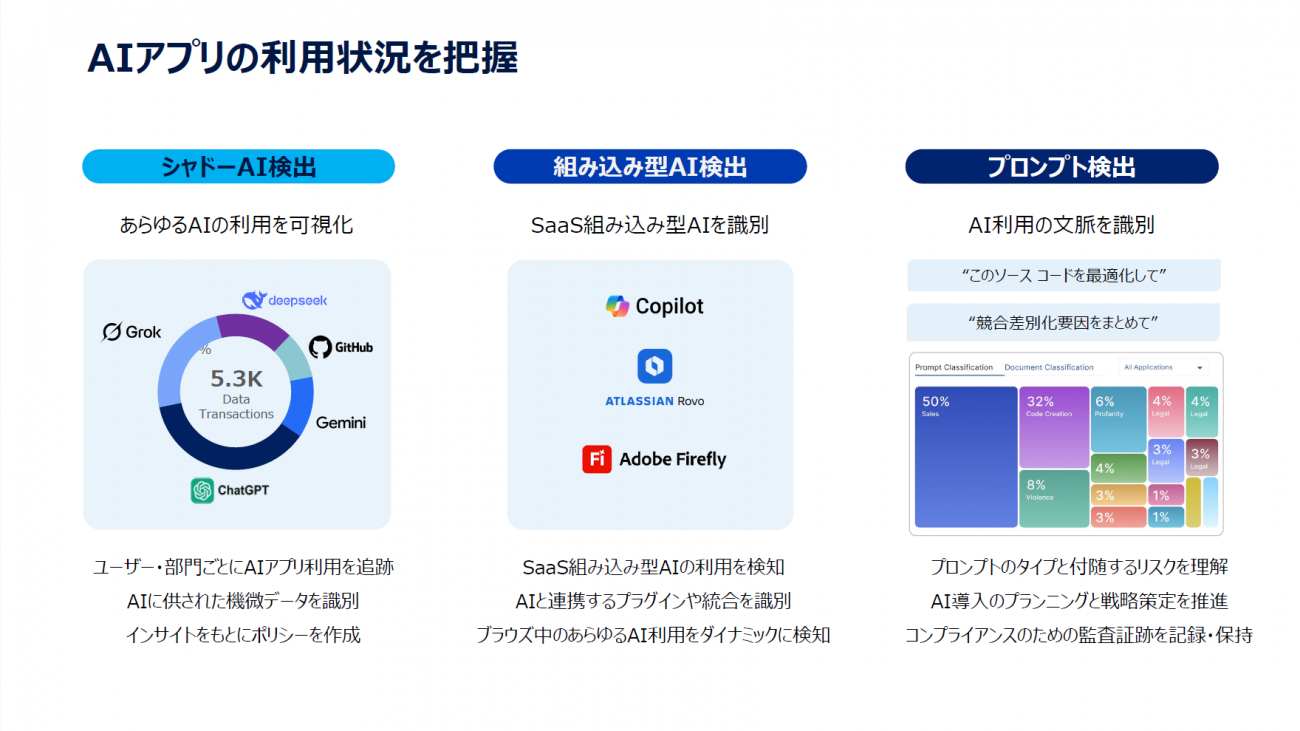 社内のどこにAIに関するセキュリティリスクがあるのかを可視化、特定する。具体的には、組織の中で使われているAIアプリケーションを洗い出し、シャドーAIを検出。SaaSに組み込まれたAIも識別・検知する。そのほか、社員がAIにどのようなプロンプトを入力しているのか検出することも可能。入力されたプロンプトを分類し、どのような業務でAIが使われているのかを把握できる機能も付いている。