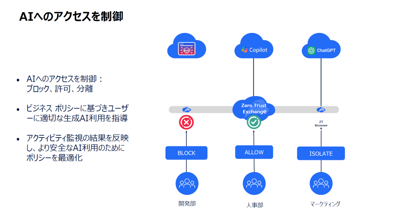 AIへのアクセスを「ブロック」「許可」「分離」の3段階で制御できる。明らかに悪意が認められるAIアプリケーションは使用をブロックし、問題ないアプリケーションは使用を許可する。また、Zscalerの機能「Browser Isolation(ブラウザ分離)」を活用することで、グレーゾーンのAIアプリケーションの利用を制御できるとのことだ。社員はAIアプリケーションを使うことができるが、そのAIに社内の機密データなどを読み込ませようとした際には利用がブロックされるという仕組みだ。