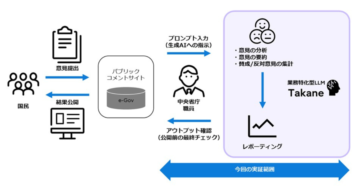 2026年2月3日、富士通は、パブリックコメント業務に大規模言語モデル「Takane」を活用した実証実験を特定の中央省庁と協働で2025年中に実施し、有効性を確認したと発表。同実証実験の成果をもとに、政策立案や法律制定のプロセスに応用できる生成AIサービスの開発に着手し、2026年度中の提供を目指すとした。
