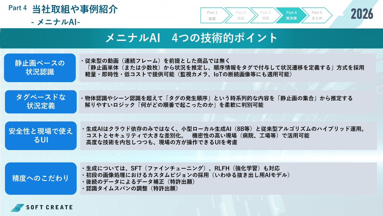 ソフトクリエイトは2月3日、中堅製造業の現場課題に特化した新サービス「メニナルAI」を発表した。同社は、深刻化する人手不足や熟練工の技術継承という製造業の構造的課題に対し、従来の画像認識の枠組みを超えて時間軸で作業工程を判別する「状況認識AI」という新たなアプローチを提示。保有する特許技術を核に、PoCの壁に阻まれてきた中堅企業のAI実装を加速させるという。