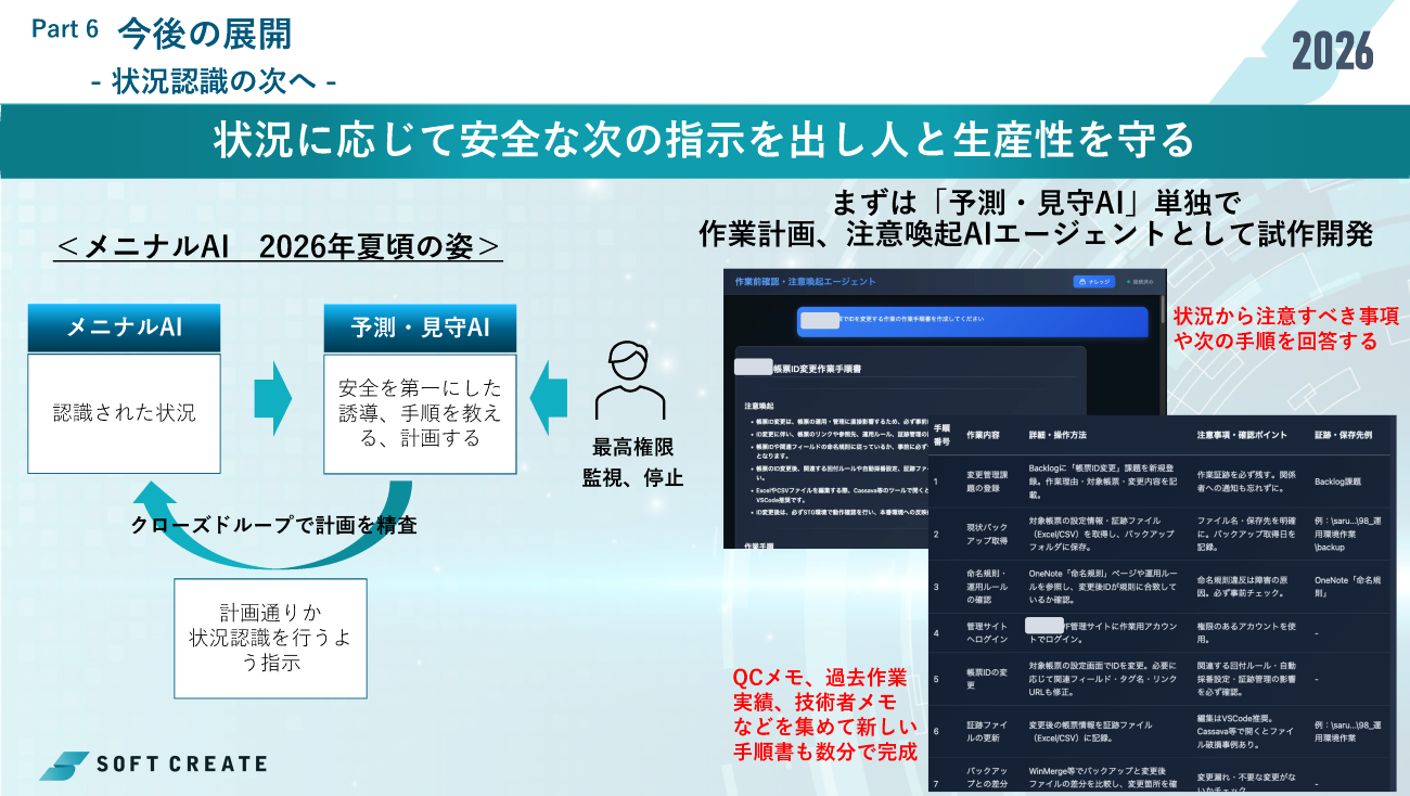ソフトクリエイトの今後の展開として、メニナルAIは状況認識に加えて安全な次の行動を提案する「予測・見守AI」へと発展し、手順書の自動生成など現場判断を高度化させていく。さらに、機器制御を担う「ウデニナルAI」なども拡充し、現場に溶け込む「○○ニナルAIシリーズ」として進化させる計画だ。畠山氏は「フィジカルAI時代に必須の状況認識基盤となりたい」と展望を語った。