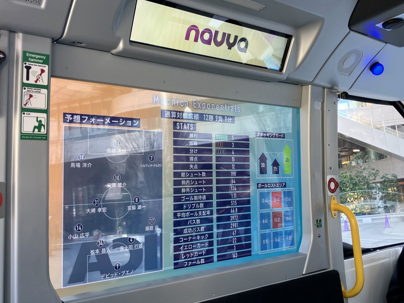 目玉展示の一つとなったのは、マクニカの子会社であるNavya Mobility製の新型自動運転EVバス「EVO3」だ。今回は、オフィシャルテクノロジーパートナー契約を締結している、横浜FCとのコラボレーション。スタジアムへの試合観戦に向かうバスという設定で、社内ではフォーメーションや選手コメントなどが投影される中、運転手がいないレベル4の自動運転が行われた。