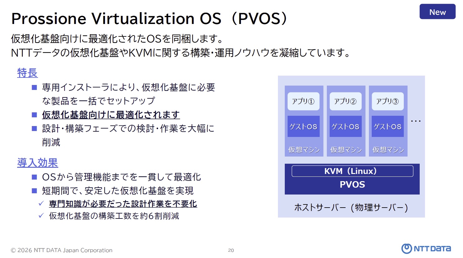 NTTデータは2026年2月12日、KVM(Kernel-based Virtual Machine)ベースの仮想化基盤サービス「Prossione Virtualization 2.0」の説明会を開催した。2025年7月に提供開始した1.0から大幅に機能を拡充し、専用OSの同梱、GUI/APIによる一元管理、高可用性機能、仮想マシン移行支援ツールなどを備えた“本命バージョン”として、2026年3月から提供を開始する。VMwareのライセンス体系変更を背景に仮想化基盤の再選定が進む中、「主権を確保したシステム基盤」を掲げ、国内市場への本格展開を狙う。