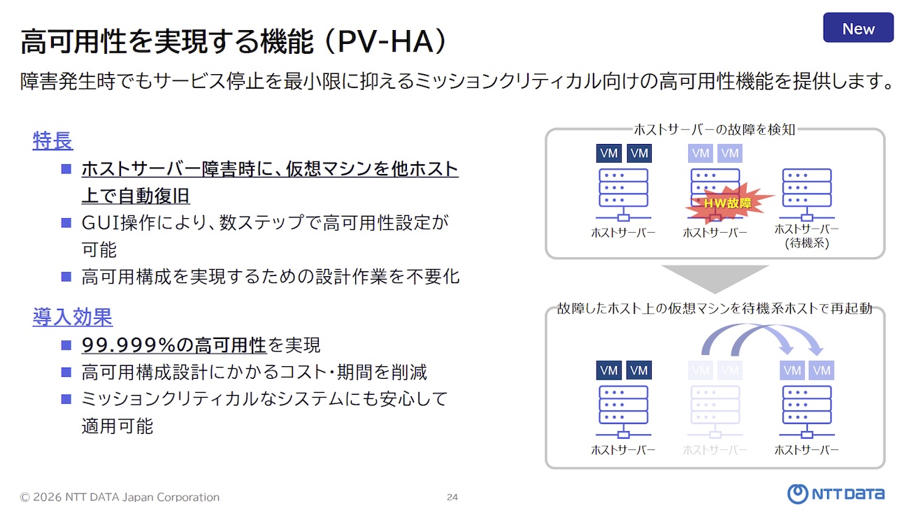 エンタープライズ顧客が強く求めていた高可用性機能「PV-HA」も2.0の目玉だという。ホストサーバーの物理故障を検知すると、そのサーバー上の仮想マシンを待機系ホストで自動的に再起動する。設定は「フェイルオーバー先の指定」と「HAの有効化」のわずか2ステップで完了し、99.999%の高可用性を実現する。「裏ではかなり難しいメカニズムが動いているが、非常に簡単に設定できる」と濱野氏は説明した。