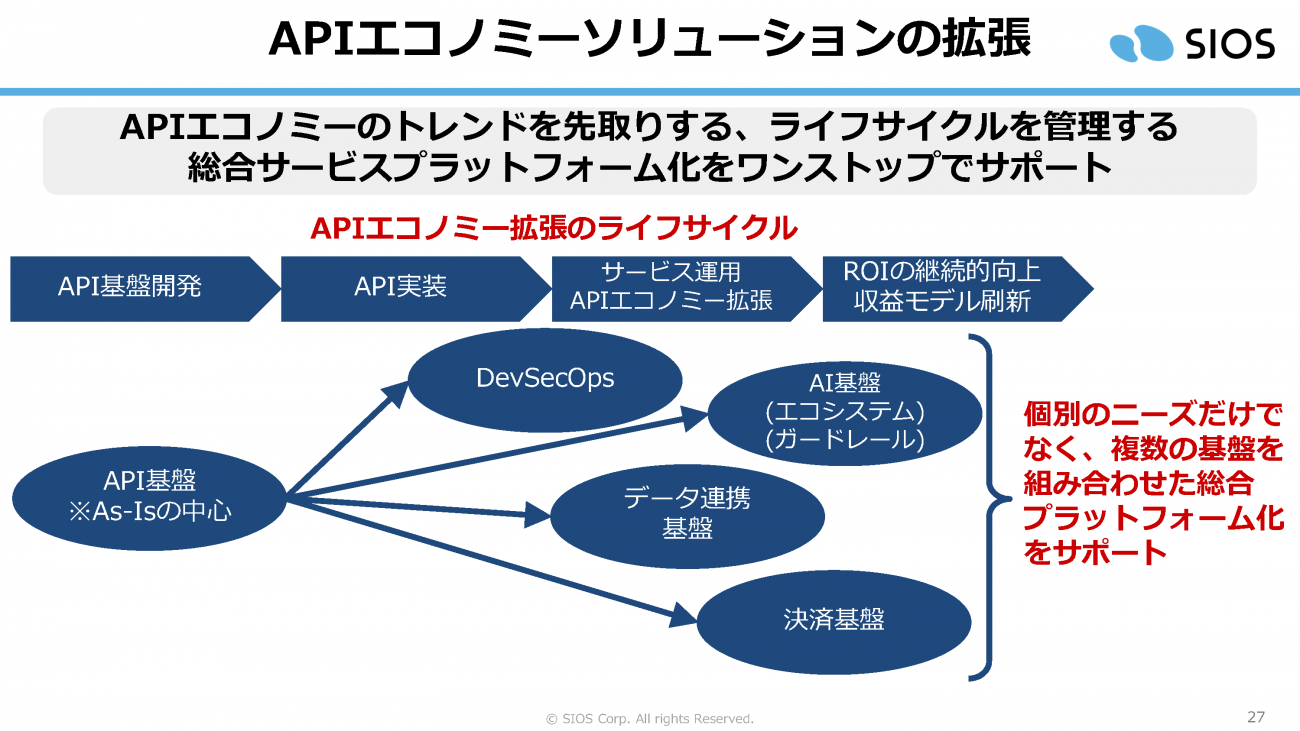 こうした潮流に対し、同社はAPIのライフサイクルを管理する「総合サービスプラットフォーム」を提供することで、他社との差別化を図るという。具体的には、開発・運用を効率化するDevSecOpsの強化に加え、複数のAIをAPI経由で使い分ける際のガードレールとなるAI基盤やデータ連携基盤、さらに複雑な収益管理を行う決済基盤などの提供を通じて、企業のデジタル変革を技術面から全方位で支援する体制を整えるとした。