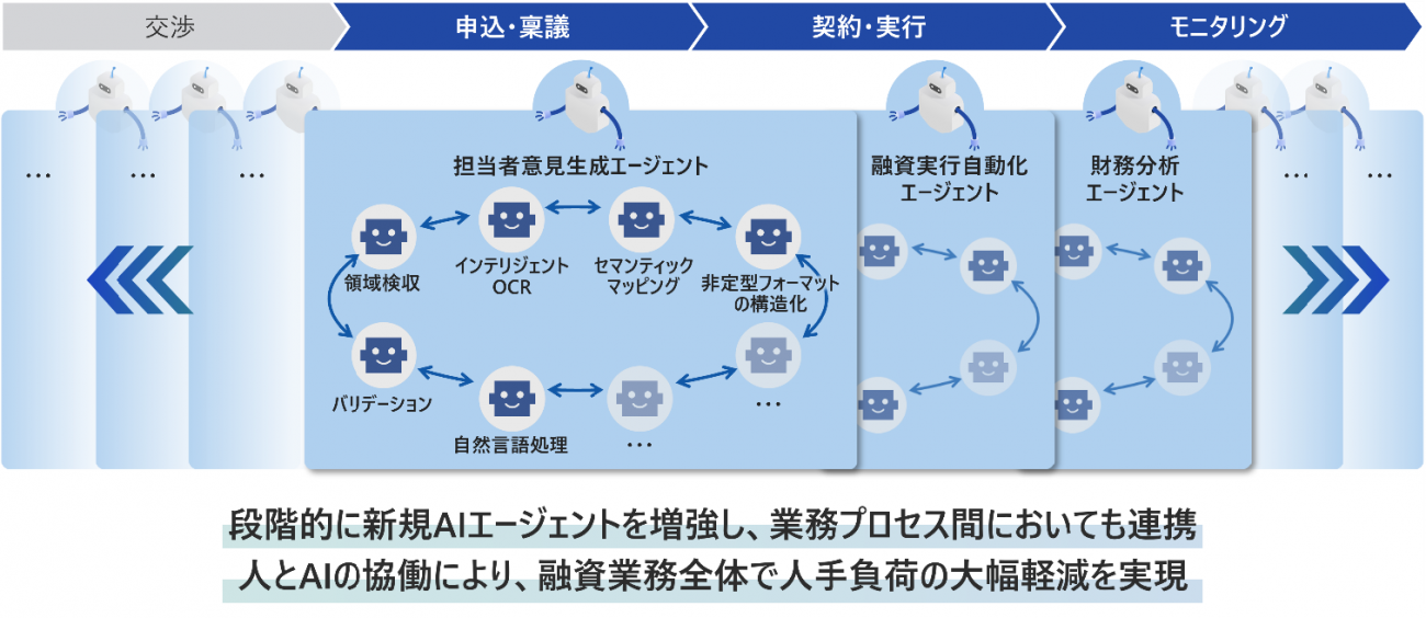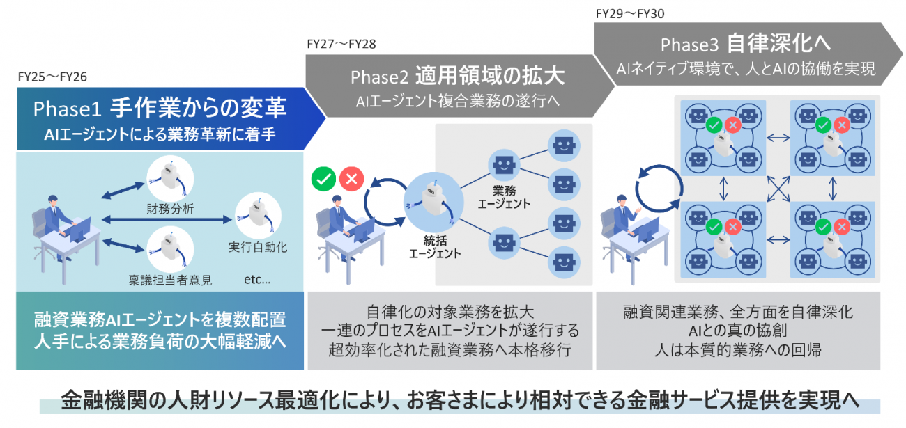 今回の協創は、業務プロセスの分析から判断、最適化までの一連の流れにAIエージェントを適用・連携させることで、これまで人手に頼っていた業務の段階的な自律化を目指すもの。人とAIの協働によって業務負荷の軽減を図ることで、将来的には年間数万時間規模の業務時間の削減を可能と試算しているという。これにより、創出された時間や人材リソースを行員と顧客が相対し、傾聴・議論を必要とするコミュニケーション機会に充て、課題解決に向けた提案活動を強化できるとしている。