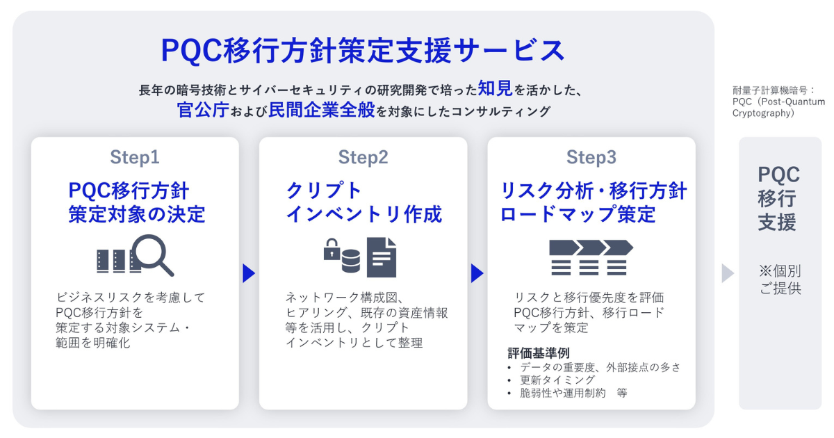2026年2月27日、日本電気(NEC)は、官公庁および民間企業全般を対象に「耐量子計算機暗号(PQC:Post-Quantum Cryptography)移行方針策定支援サービス」の提供を開始した。