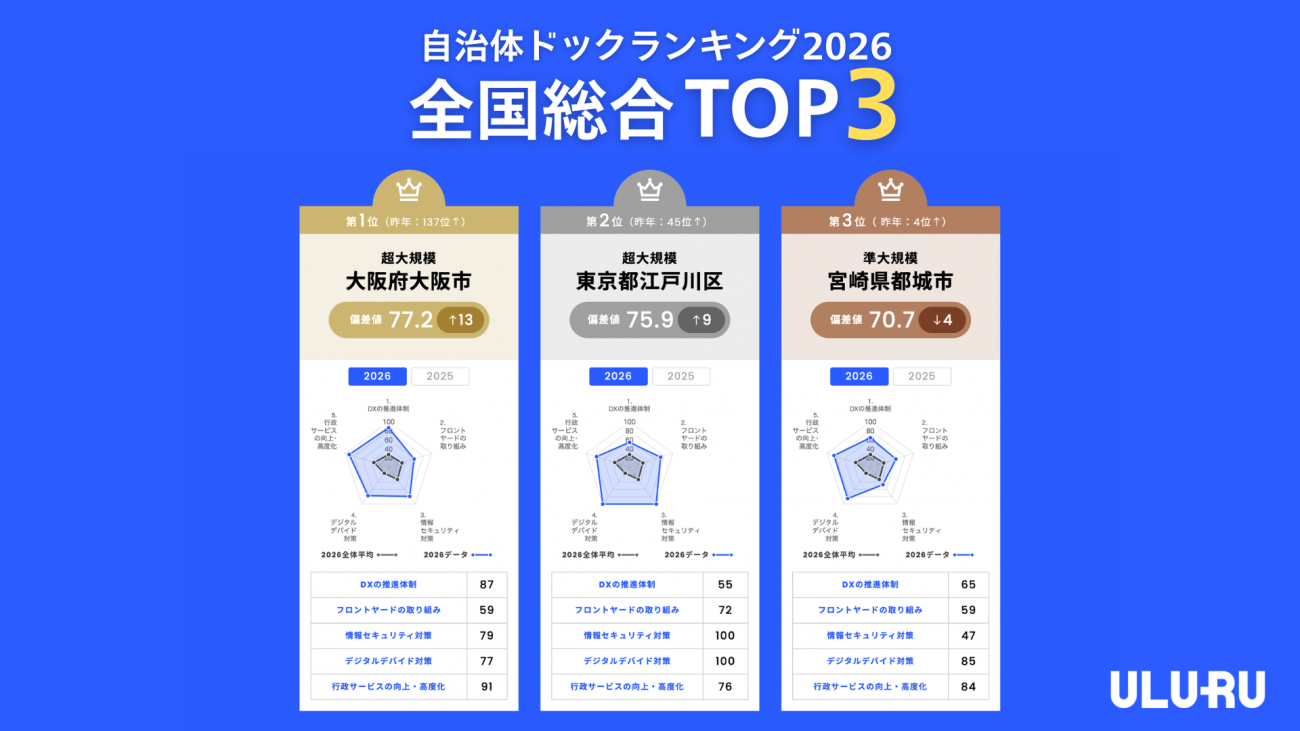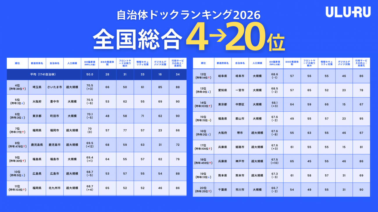 うるるは2026年2月、全国1,741自治体を対象にDX推進度をスコア化し可視化する「自治体ドックランキング2026」を公開した。同ランキングは、総務省が実施する「自治体DX・情報化推進概要(地方公共団体における行政情報化の推進状況調査結果)」をもとに、うるる独自の評価設計で5分野316項目に基づきスコア化し、偏差値を算出したものである。