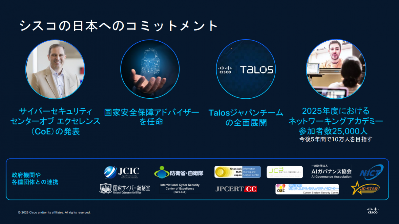 その一環として、2025年にCiscoが発表したセキュリティ特化のLLM(大規模言語モデル)である「Foundation AI」の日本への展開などが既に始まっている。たとえば、このLLMから生まれたAIモデル「SecureBERT 2.0」は、オープンソースのAIモデルとしてGitHubなどで展開済みだ。情報通信研究機構(NICT)との協業で今後も追加の開発などを検討していくという。