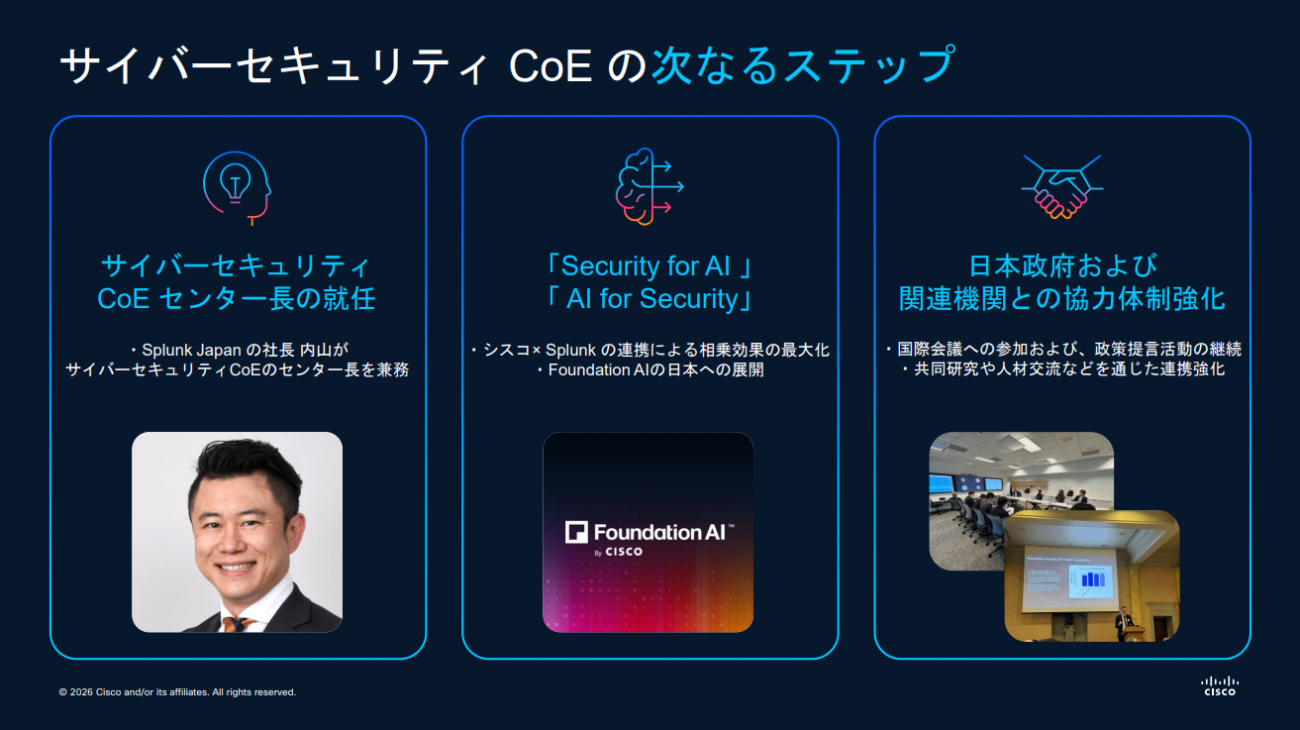 CoEのセンター長には、同社が買収したSplunkより、内山純一郎氏(Splunk Services Japan 社長執行役員)が就任した。今年度は、従来のサイバー脅威対応や人材育成、政策支援に加えて、「Security for AI(AIを守る)/AI for Security(AIで守る)」の分野にも活動領域を広げていくという。