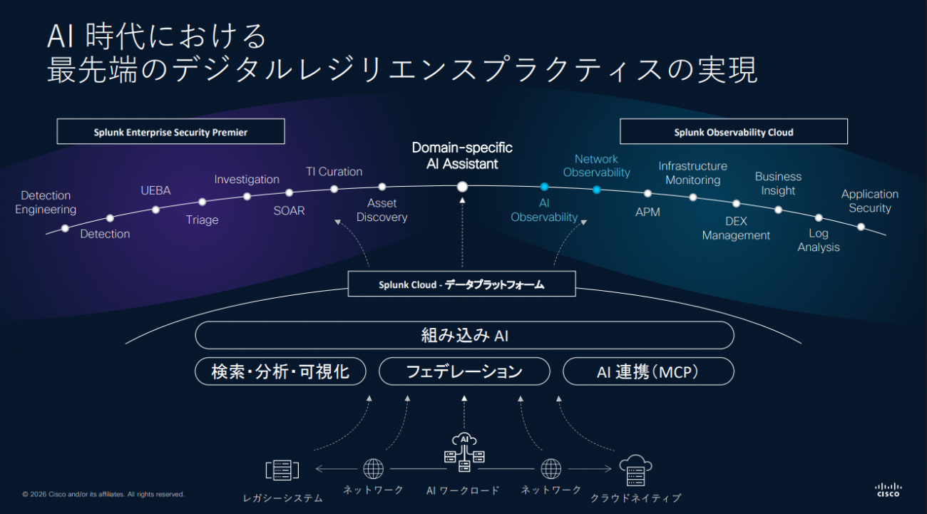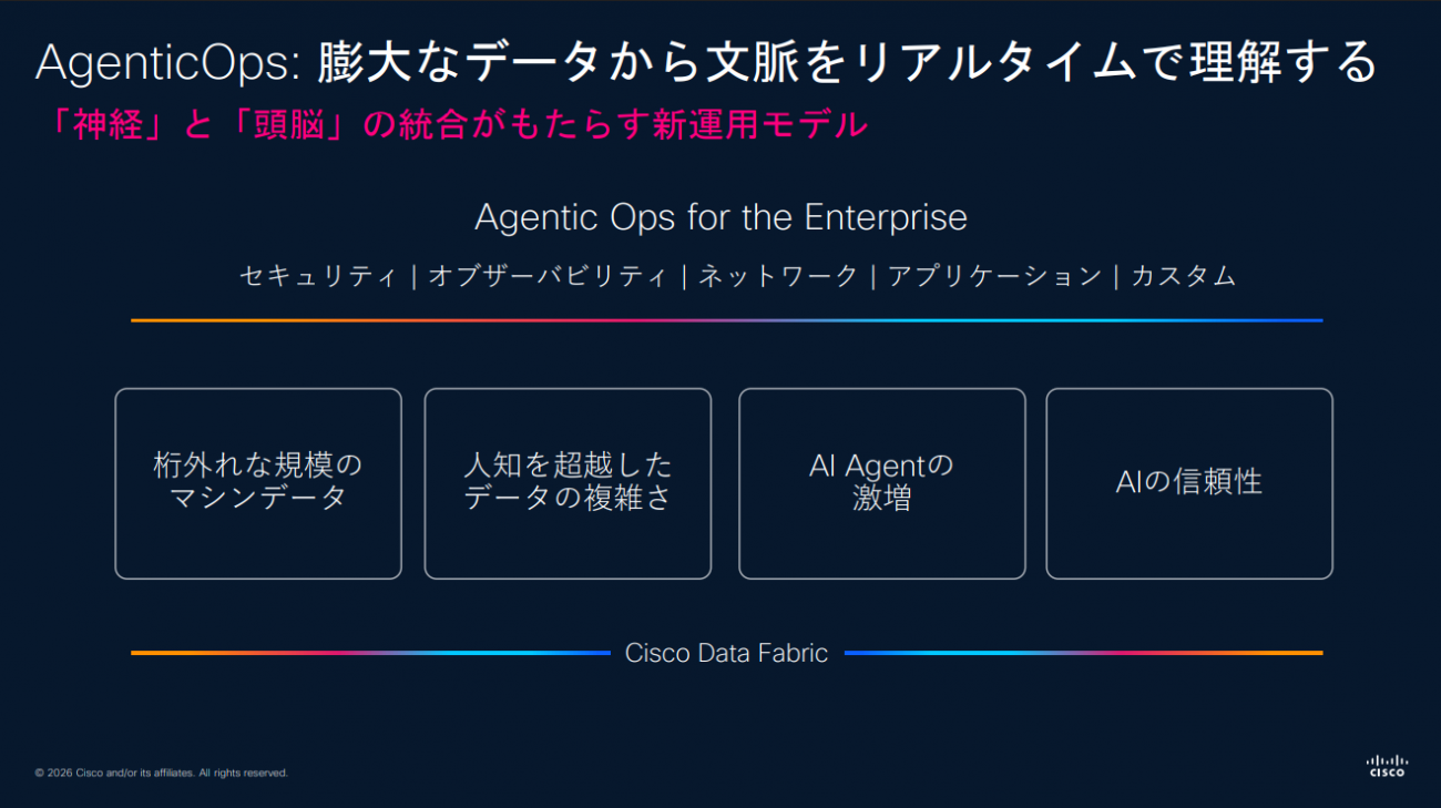内山氏は、CiscoとSplunkの融合が進んでいる点も強調した。「Ciscoは世界最大級のネットワーク可視性を持つ。いうなれば強靭な“神経”、つなぐ力だ。そしてSplunkは“頭脳”の役割を果たす。ここに両社の統合の本質がある。『Ciscoが捉えて、Splunkが理解する』──そしてAIエージェントの暴走や侵害を止める」と同氏は述べ、この運用モデルを「AgenticOps」と呼んだ。