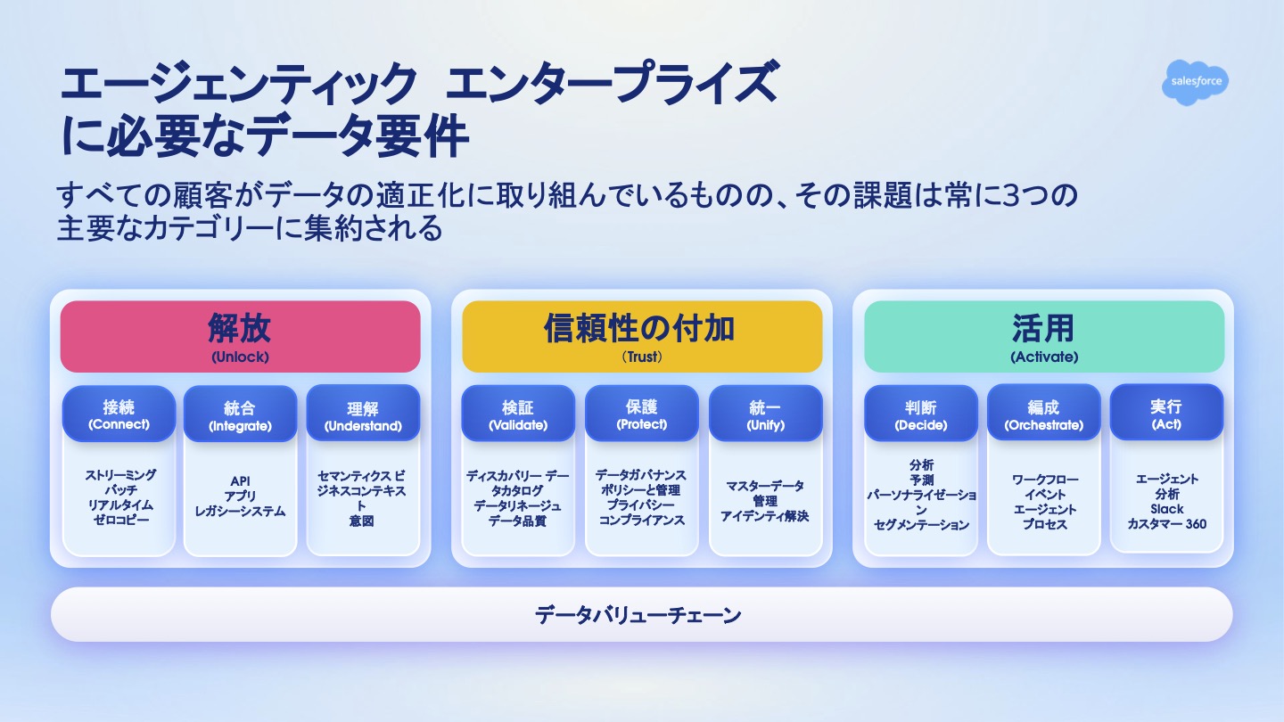 まずデータの解放(Unlock)として、MuleSoftのリアルタイム連携とInformaticaのETL/ELTにより、ERPやレガシーシステムに散らばるデータを人とAIが理解・利用可能な形に引き出す。次にデータへの信頼性付加(Trust)として、InformaticaのMDMとデータガバナンス技術で表記揺れや重複を排除し、ゴールデンレコードを作成する。これによってAIのハルシネーションやセキュリティリスクの最小化が図られる。最後にデータの活用(Activate)として、クリーンでガバナンスの効いたデータをData 360経由でAgentforceへ提供し、MuleSoftのAgent FabricによるAIエージェントの一元管理も合わせて行うことで、企業全体で統制された顧客体験の向上を実現する。