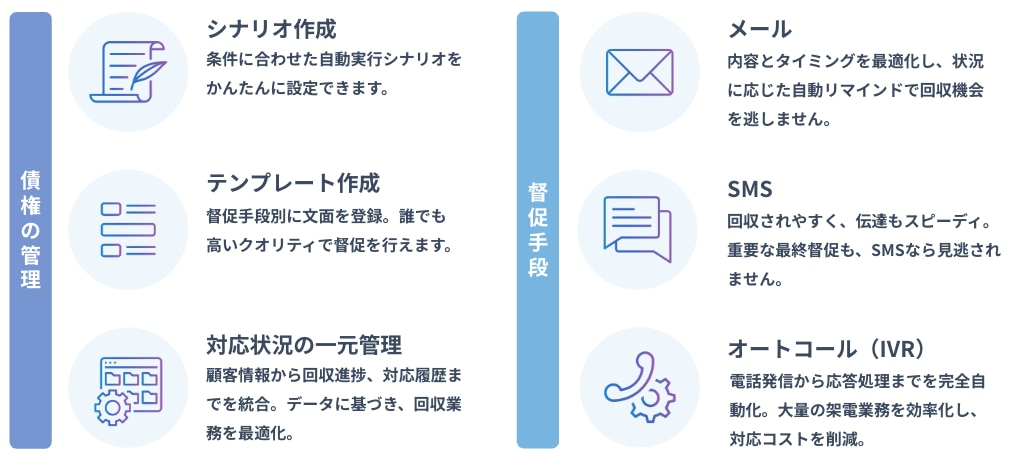 • データ資産の構築:督促における「いつ・誰に・どのような文面で」という全プロセスをデータとして蓄積することで、債権回収を効率化