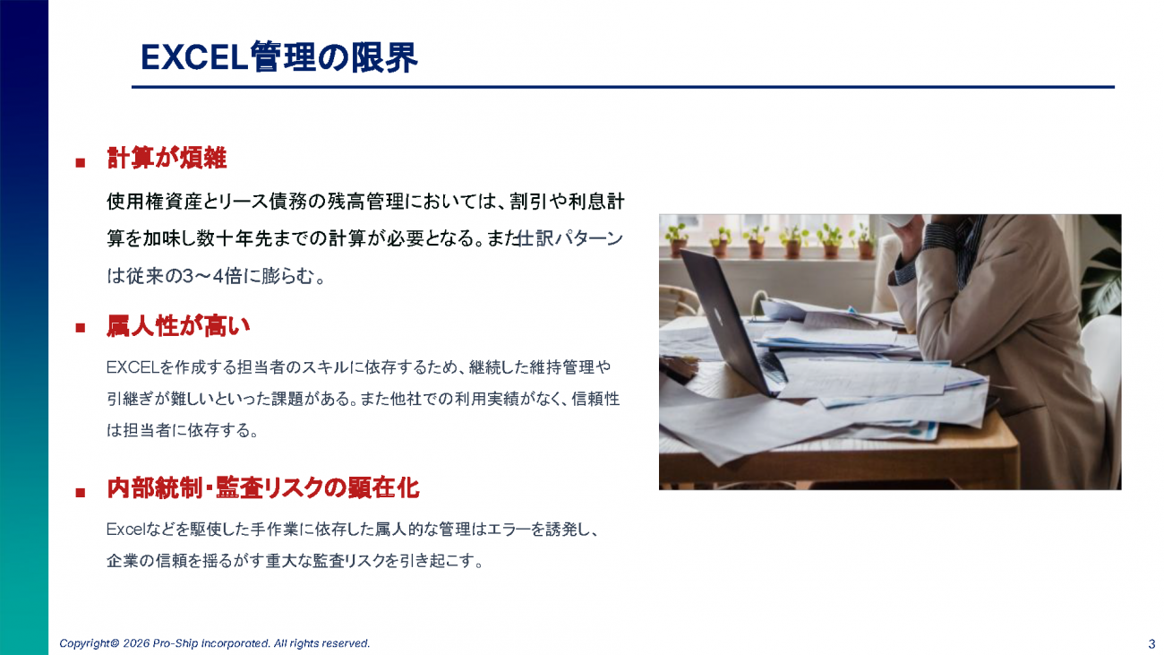 新リース会計基準の適用により、従来オフバランス処理されていたオペレーティング・リースを含むほぼすべてのリース契約が資産・負債として貸借対照表(BS)に計上される。総資産利益率(ROA)や投下資本利益率(ROIC)といった主要な財務指標の悪化を招く可能性があり、経営層にとっては「2027年問題の一つ」となっているという。会見では、AIを活用して契約判定から資産管理までを自動化し、深刻な人手不足とシステム分断を解消する解決策が示された。