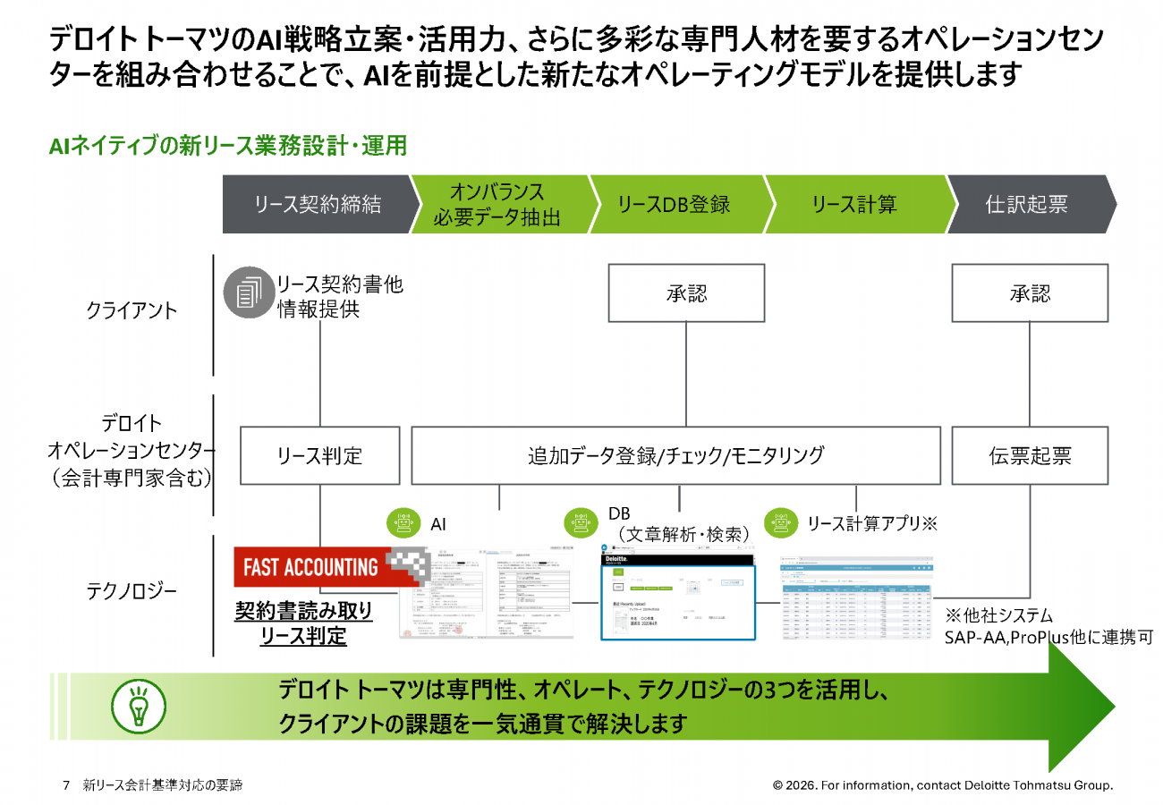 既存の協業先でもあるデロイト トーマツとも新リース会計基準への対応案件において連携を開始する。同社は、群馬県前橋市と北海道札幌市にBPOをはじめとしたコーポレート業務のプロセス変革を推進するオペレーションセンターを有している。このオペレーションセンターにおける、契約のリース判定にファーストアカウンティング社のAIを活用するという。AIで判断が難しいケースは会計知見を持つ担当者が確認するなど、AIと人の役割分担を前提とした実務モデルを想定している。デロイト トーマツ 代表執行役 岩村篤氏は「外部委託や同業他社との協力は拡大の余地がある。このスキームが課題解決の一助となれば」と話した。