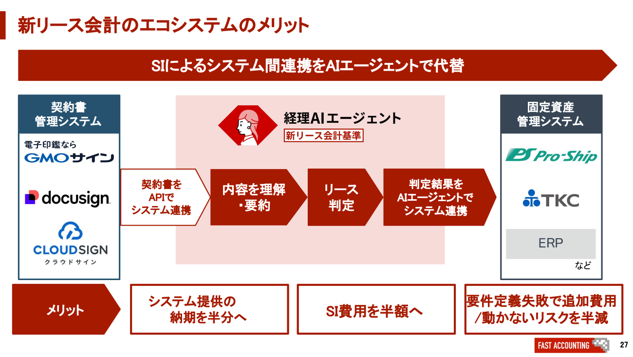 そこで同社は、AIによるリース判定を中心に、経理業務で分断されている契約書管理、リース資産管理、業務オペレーションをつなぎ、一気通貫に対応できる「エコシステム」の構築を進めているとした。
