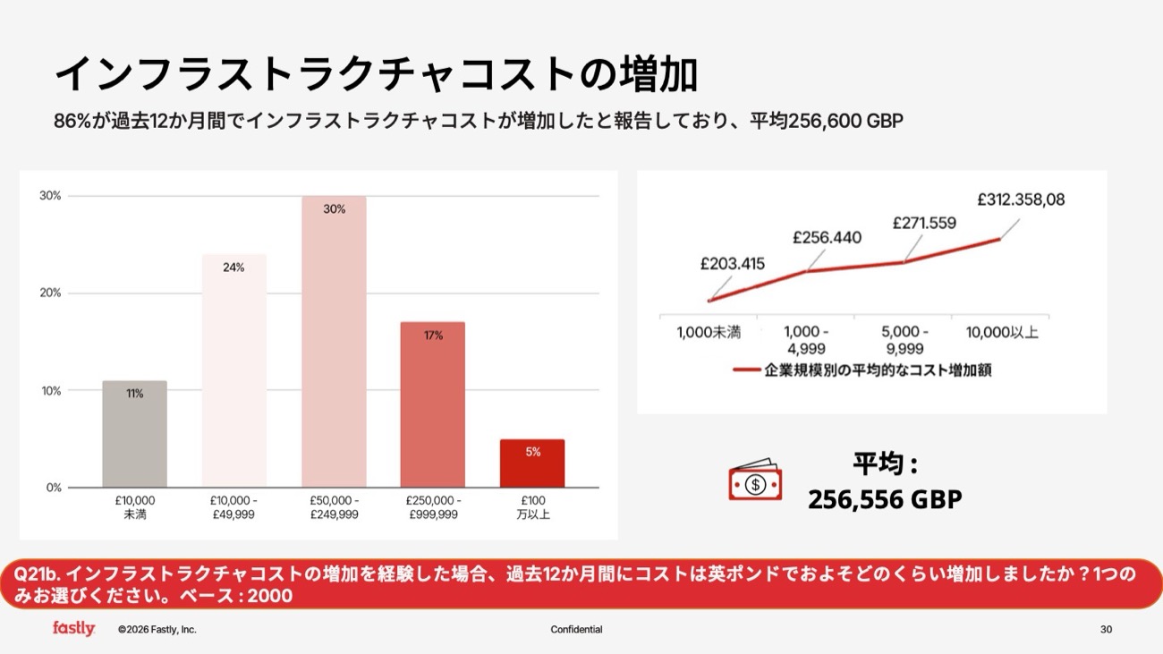 日本企業の73%がAIツールやボットによるスクレイピングの影響を経験しており、39%が業務停止やパフォーマンス低下などの運用上の混乱に直面し、36%がインフラコストの増加を報告している。インフラコストの増加平均は年間4,300万円に上る。グローバルでは80%がスクレイピングの影響を受けており、平均コスト増は約5,400万円相当となる。