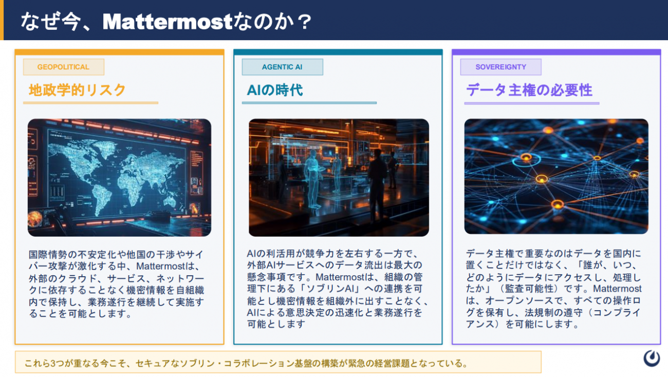 ティエン氏は、Mattermostが必要とされる背景として①地政学的な不確実性、②エージェンティック・ワールド(AIによる自律的な世界)への移行、③データ主権(ソブランティ)の必要性の3つを挙げる。