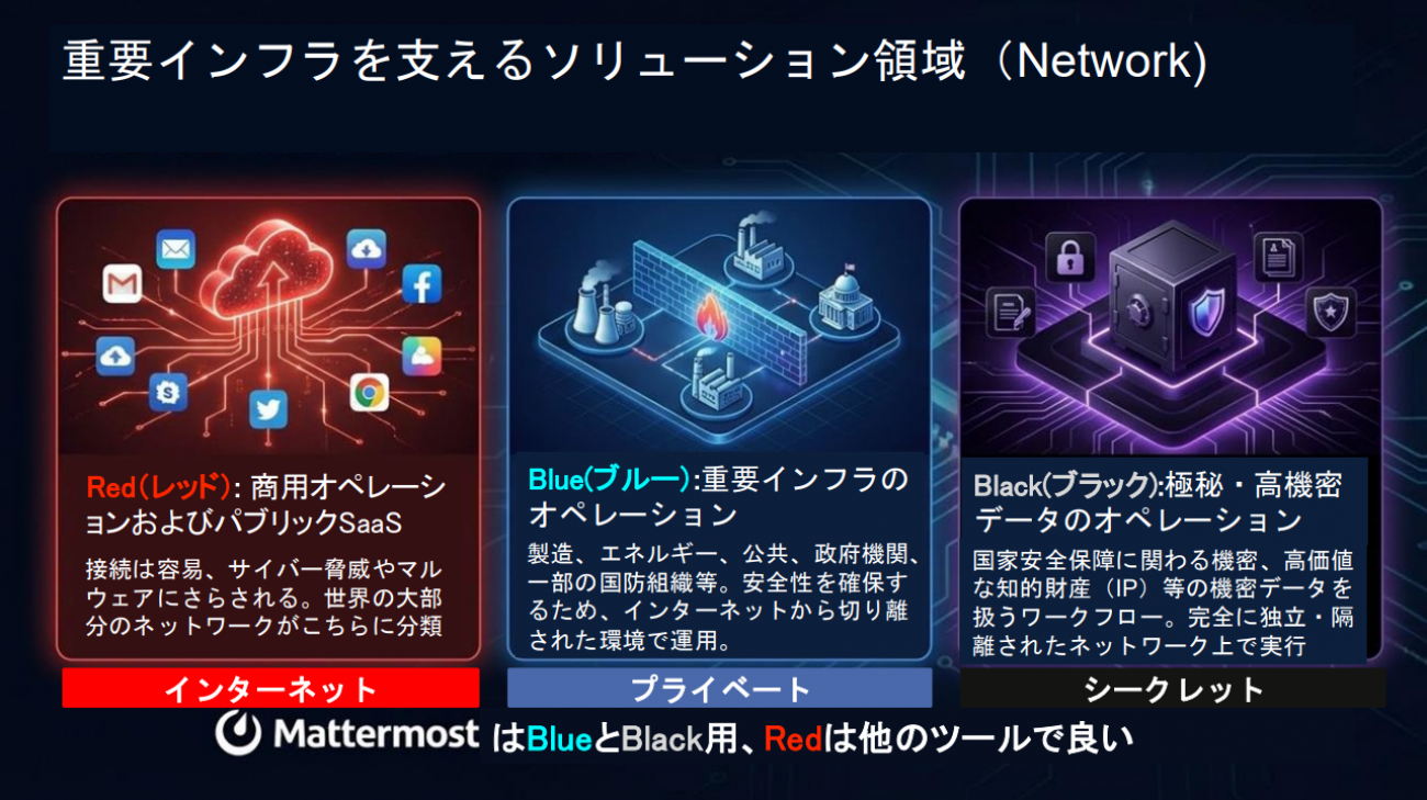 世界を3つ(レッド・ブルー・ブラック)のネットワーク領域に分けて考えたとき(次図)、Mattermostが活きるのはブルーとブラックの領域だ。
