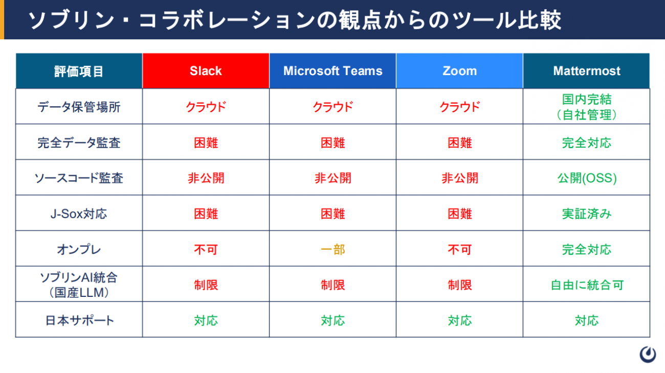 3つ目のソブランティは、Mattermostの特徴そのものといえる。「Microsoft 365やZoomなどグローバルで誰もが使うインフラサービスは溢れているが、それとは別に何事にも主権が必要だ。オンプレミスやプライベートクラウドといった、自分たちが完全にコントロールを握れる『ソブリン・コア』を持たなければならない」とイアン氏は指摘する。