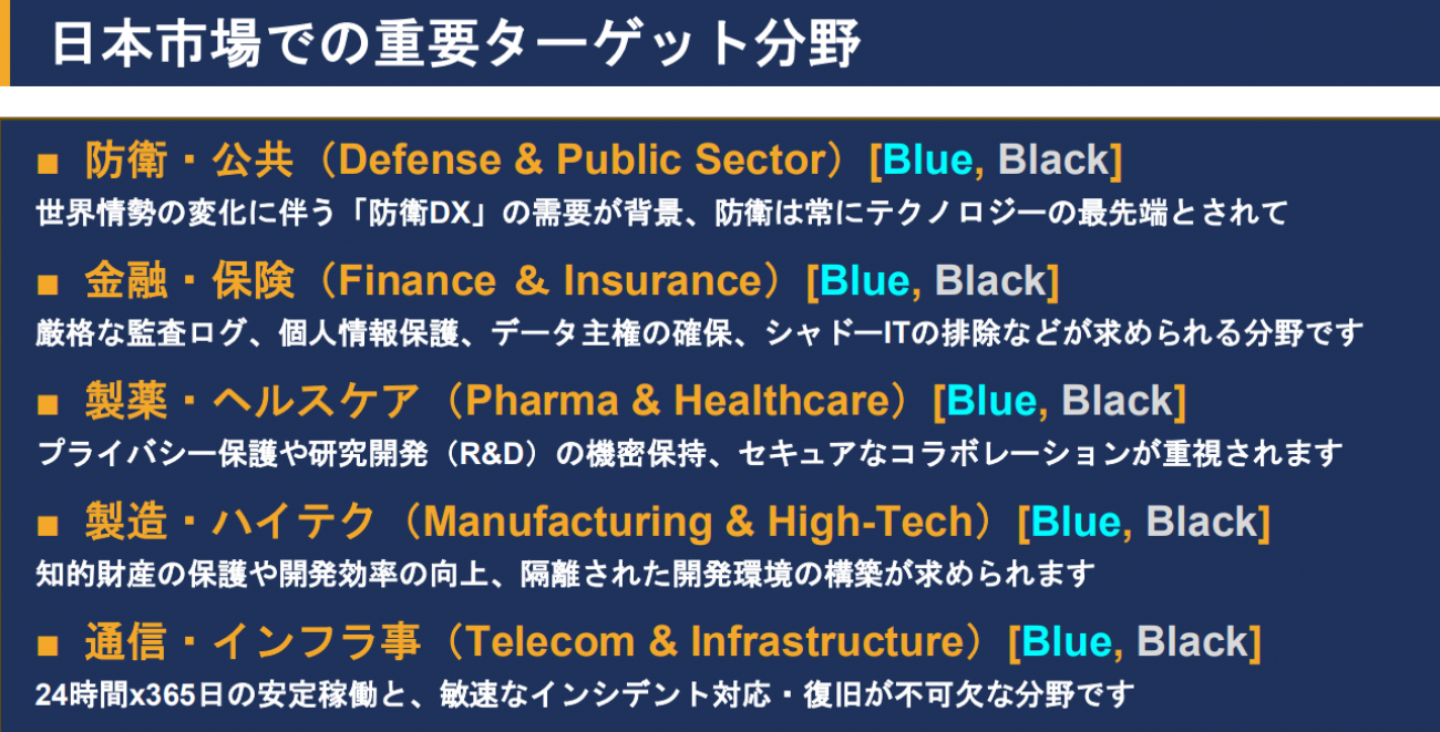 こうした防衛と主権のために設計された機能を、パブリックなサービスにも劣らない最新のテクノロジー環境で、クローズドにストレスなく利用できるのがMattermostのアピールポイントだ。日本市場での重要ターゲット分野として、原沢氏は以下(次図)を挙げた。