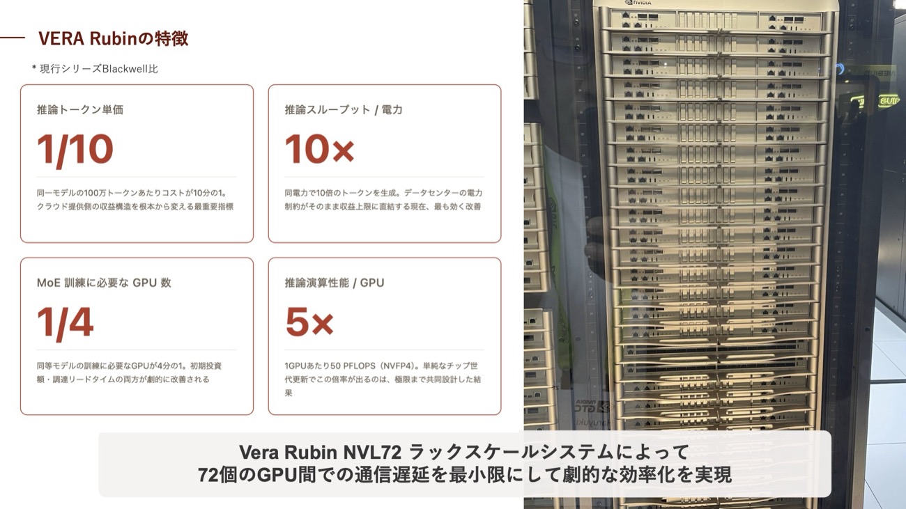 辻氏はこの効率化の核心について、「72個のGPUとCPUが1つのラックに収まり、GPU間の通信遅延を極限まで最適化した設計になっている。72個のGPUをまるで1個のように扱えるようになったことで、ものすごく効率が上がっている」と説明した。「Vera Rubin NVL72」と呼ばれるラックスケールシステムがNVLink 6 Switchでこれを実現している。また今回のアップデートでは、買収したGroq社の超低遅延推論専用チップ「Groq3 LPU」が加わり、計7チップ構成のプラットフォームとして紹介された。