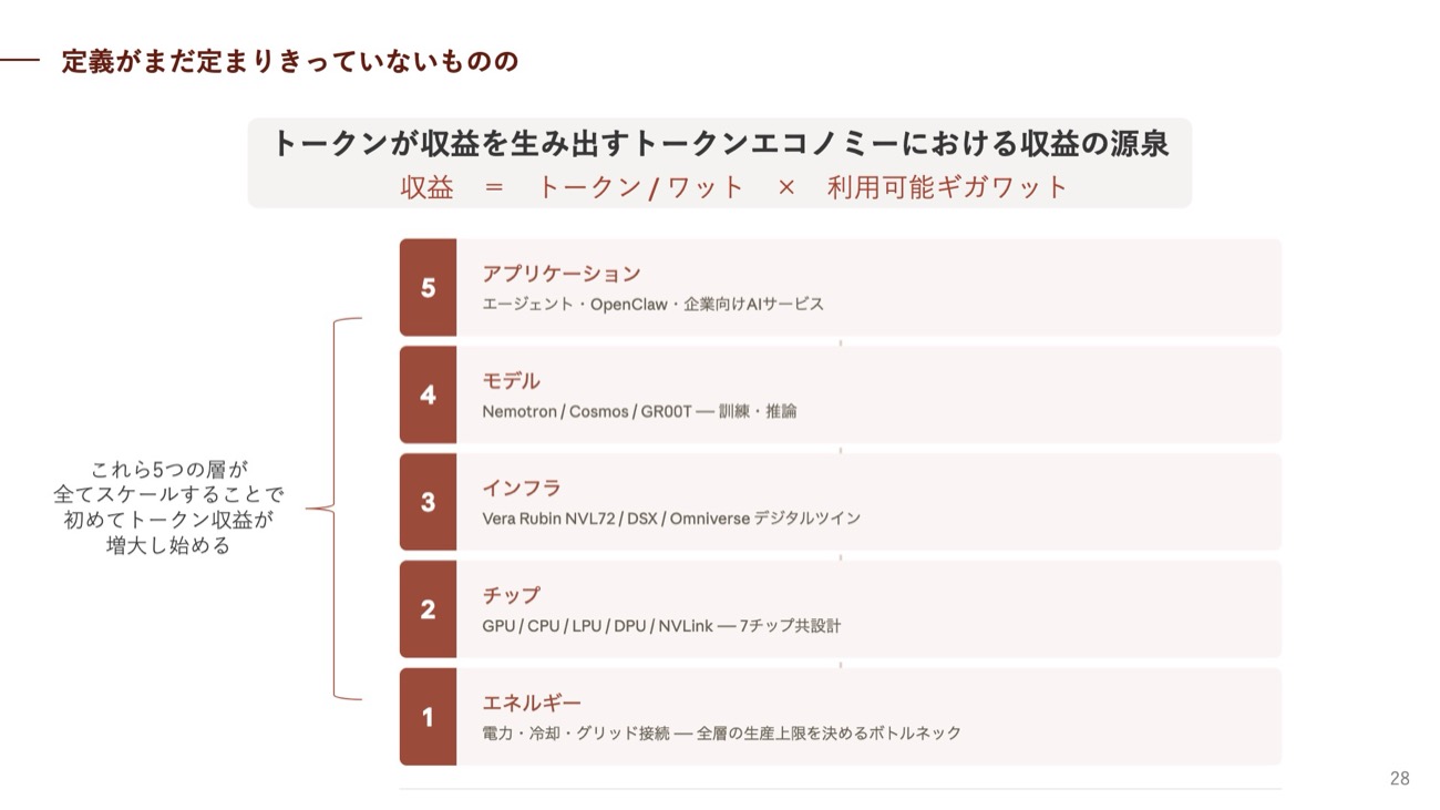 今回のGTCを通じて最も鮮明になったメッセージとして辻氏が挙げたのが「AIファクトリー」という概念だ。フアン氏はキーノートで、電力供給量(ギガワット)の上限が増やせない以上、1ワットあたりのトークン生成効率をいかに高めるかが収益に直結すると主張した。