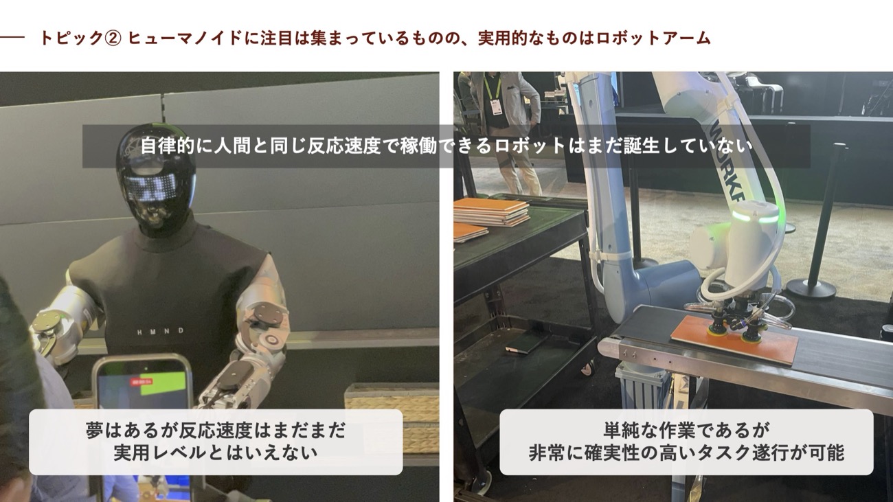 展示会場でヒューマノイド型とアーム型の両ロボットを比較した辻氏は、ヒューマノイドについて「棚にボックスを置くだけでも細かく微調整しながらゆっくりした速度感での作業だった。この電力を消費させるぐらいならアルバイトの方が100倍ぐらい早い」と率直に評した。一方、アーム型は「費用対効果が出る水準に近づいてきている印象だった」とした。