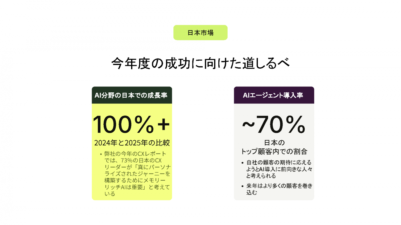 さらに、日本市場の動向について森氏は、国内の新規受注および売上全体が2桁成長を記録しており、グローバルの中でも日本が上位の成長率を維持していることを報告した。特にAI分野の成長率は前年比100%を超えており、日本のトップ顧客の約70%が既にAIエージェントを導入しているという。