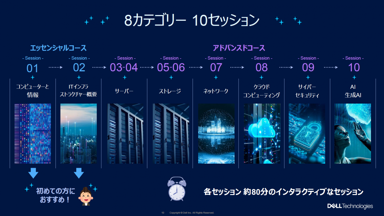 同プログラムは、サーバー、ストレージ、ネットワーク、クラウド、サイバーセキュリティ、AIといったITインフラの各項目を、初心者向けに分かりやすく解説するもの。8カテゴリー10セッションで構成されており、講座は一方的な座学形式ではなく、講師との会話を重ねながら進められる。各セッションの概要は以下のとおり。