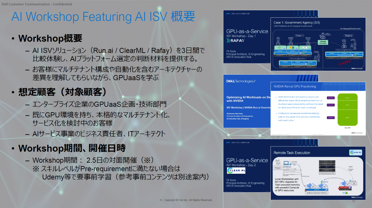 • AI Workshop Featuring AI ISV:Run.aiやClearML、RafayなどのAI ISVソリューションを3日間で比較体験し、AIプラットフォーム選定の判断材料を提供する講座。マルチテナント構成や自動化を含むアーキテクチャの差異を理解しながら、GPUaaSについて学べる
