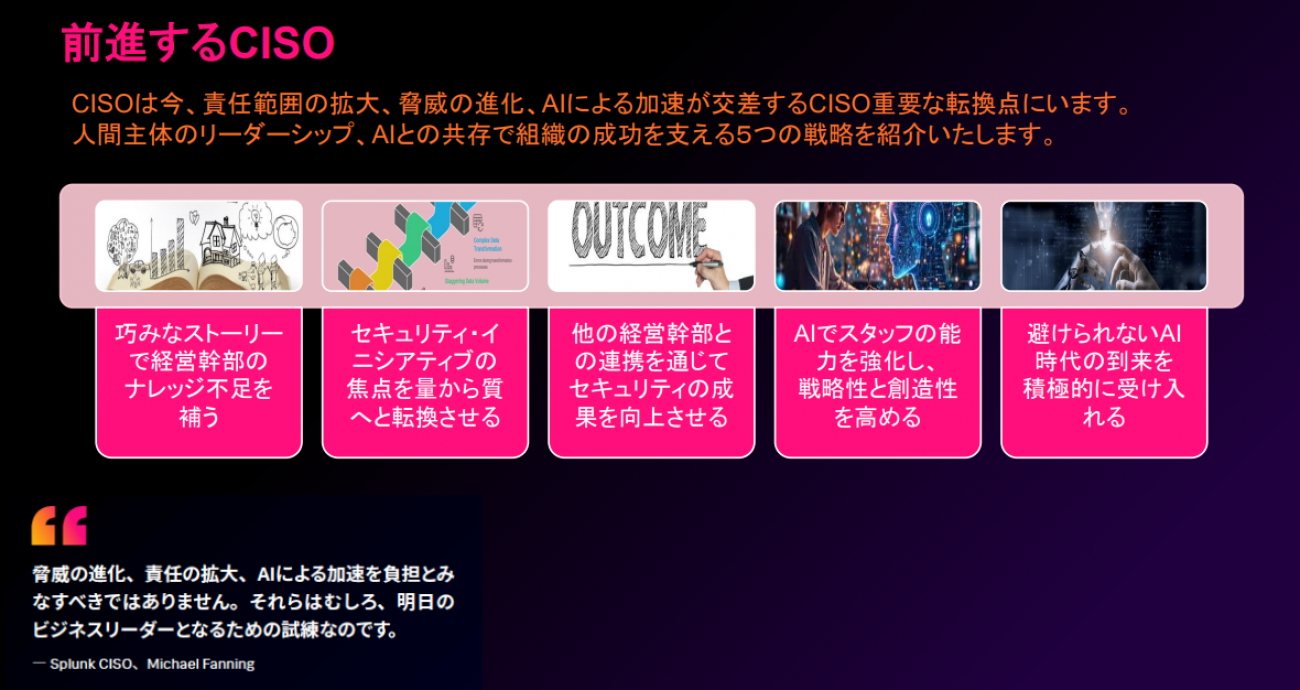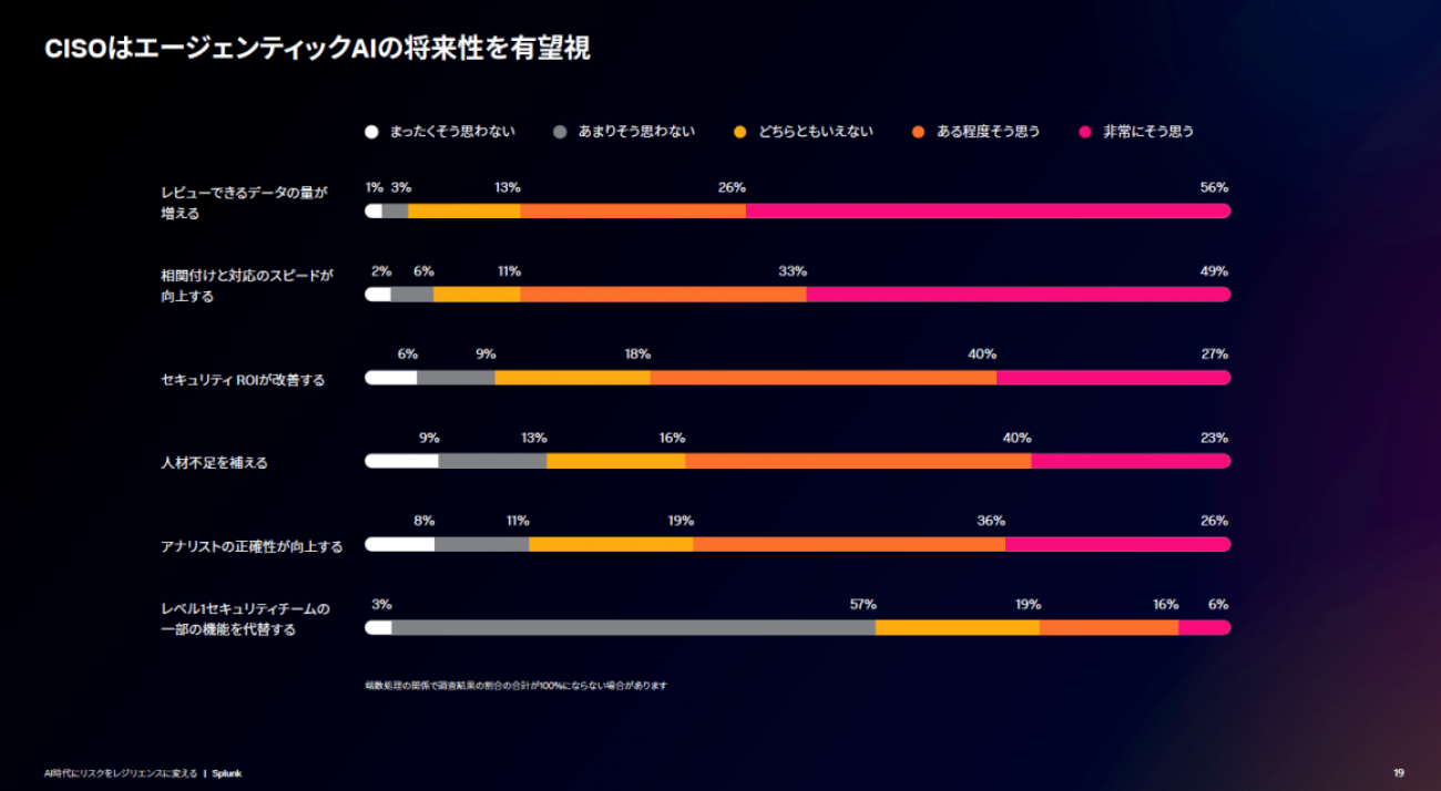 ただしAIを導入するうえで、その効果を測定する仕組みづくりを欠かしてはならない。Splunkの調査によれば、いまだ多くのCISOが、従来用いてきたMTTD(平均検出時間)やMTTR(平均対応時間)などのメトリクスをAIの価値定量化にも使っているという。AI戦略の成熟度が高まれば、これだけでは不十分になるとのことだ。ではどうするか。解決手段はやはりAIだ。AIで検出品質やリスクスコア、コンプライアンス状況をより適切に測定することで、AIの効果をより正確に評価できるようになるとしている。