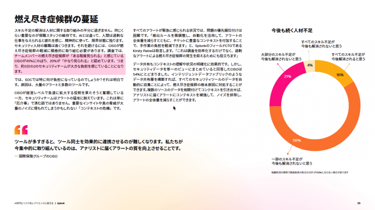 こうしたテクノロジー環境の変化が著しい昨今だが、今年も引き続きCISOの関心はテクノロジーそのものよりも「人材」にあるようだ。人員やスキルの不足はもちろんのこと、それらを悪い意味で助長する“燃え尽き症候群”が課題として挙げられた。セキュリティ担当者の負担はグローバル共通の問題のようだ。