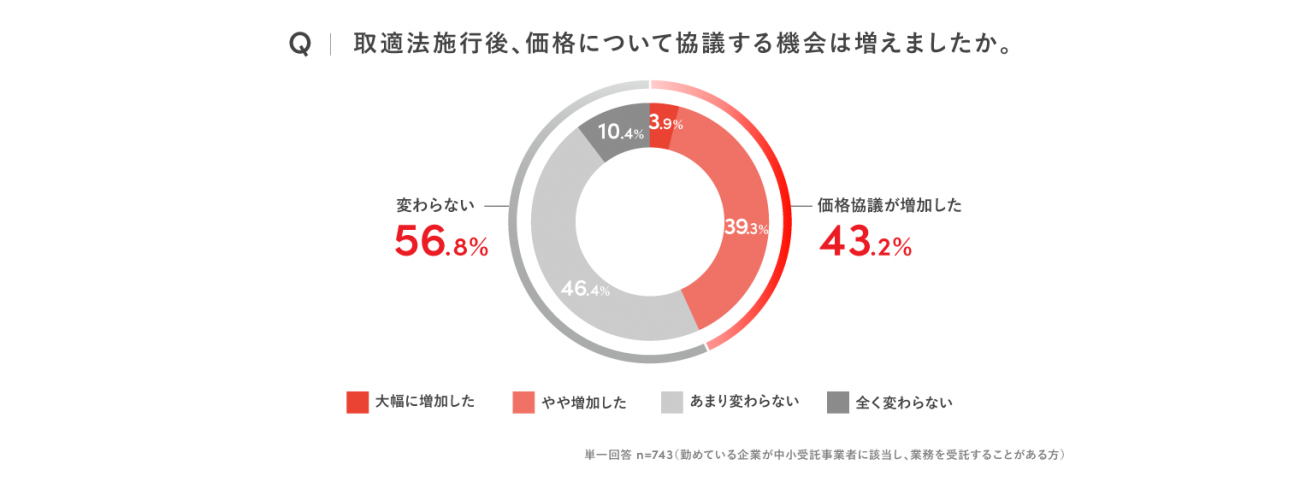 取適法施行後、受注者の4割以上は価格協議が増加する一方、6割は協議の機会が増加せず