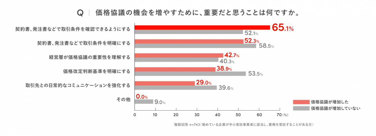「価格協議の機会を増やすために、重要だと思うこと」を聞いたところ、前問で取適法で価格協議の機会が「増加した」と回答した層では、65.1%が「契約書、発注書などで取引条件を確認できるようにすること」を挙げ、最多だった。一方、価格協議の頻度が「変わらない」と回答した層は、同項目について52.1%が重要項目として挙げており、10ポイント以上の差が生まれている。