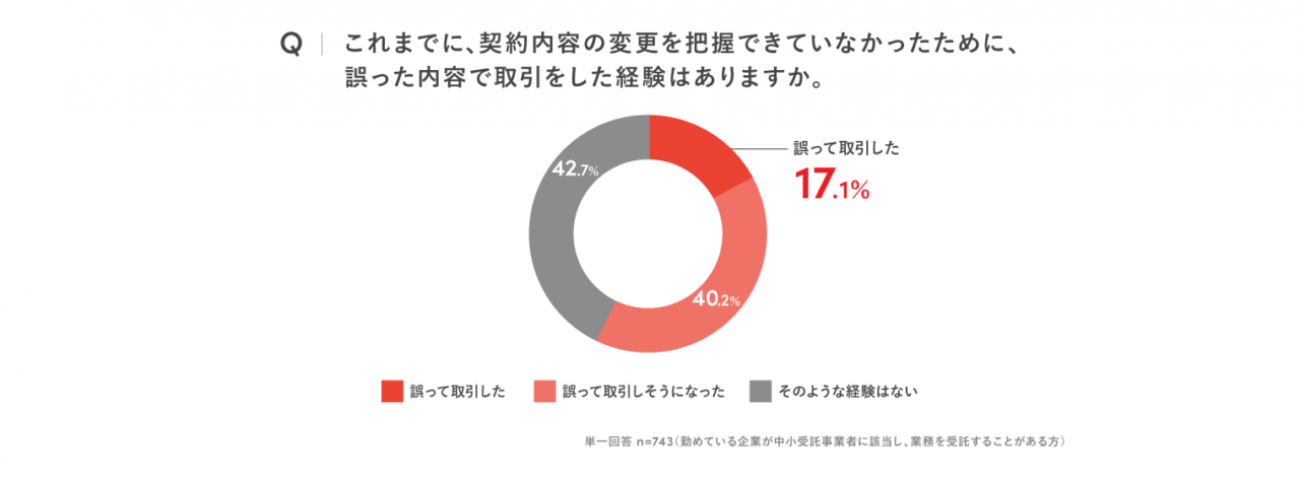 また、「これまでに、契約内容の変更を把握できていなかったために、誤った条件で取引をしてしまった経験はあるか」についても、「誤った内容で取引をした経験がある」と回答した人が17.1%にのぼった。法改正で契約内容の変更が増加する中、変更点も含めて契約情報を管理し、最新の契約条件を把握することが適正な履行においても不可欠であることが示唆されているという。